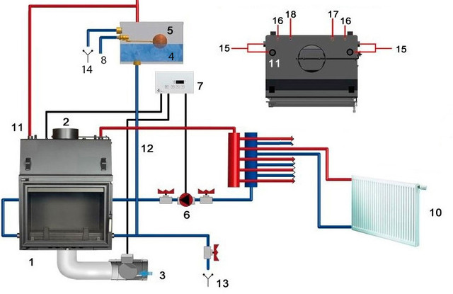 Існує й інший варіант підключення: камін підключається безпосередньо до системи опалення. У такому разі сам камін повинен бути розрахований на відповідний тиск, а насоси повинні працювати через блок безперебійного живлення.